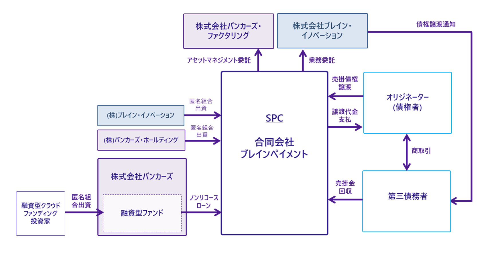 バンカーズの融資型ファンドは、売掛債権購入資金を資金使途としたSPCへの融資を行い、SPCは主体としてファクタリング業務を行います。売掛債権の未回収リスク低減のため、ブレインイノベーションはSPCから業務委託を受け、オリジネーターに対するコンサルティング、売掛債権の実在性の確認、債務者の支払能力の評価、SPCが購入した債権について債務者への債権譲渡通知などの保全業務担います。なお、SPCのアセットマネジメント業務はBKFが行います。