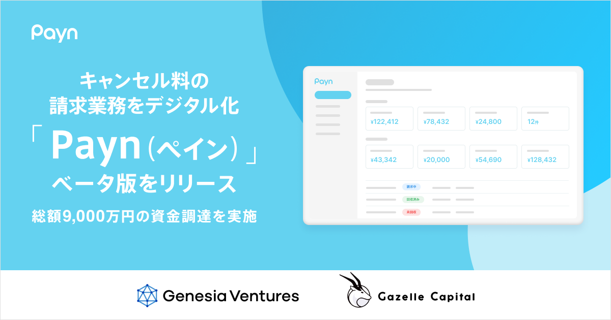 Payn株式会社(本社:東京都中央区、代表取締役CEO:山下恭平、以下「当社」)は、本日、キャンセル料の請求業務をデジタル化する『Payn(ペイン)』のベータ版をリリースいたしました。あわせてジェネシア・ベンチャーズ、Gazelle Capitalを引受先とする総額9,000万円の資金調達を実施いたしました。今回調達した資金をもとに、正式版リリースに向けたプロダクト開発や営業、サポート体制構築のための人材採用を進めてまいります。