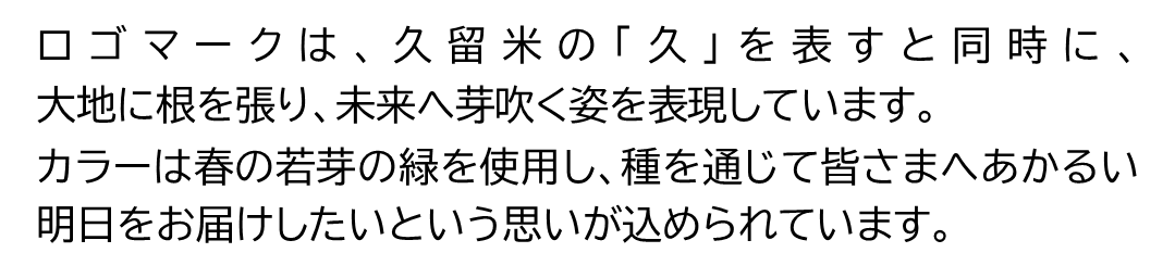 ロゴマークは、久留米の「久」を表すと同時に、 大地に根を張り、未来へ芽吹く姿を表現しています。 カラーは春の若芽の緑を使用し、種を通じて皆さまへあかるい明日をお届けしたいという思いが込められています。