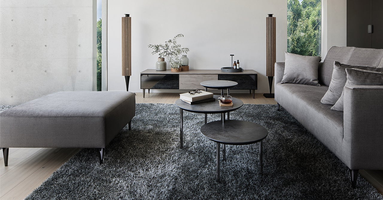 セラミックとブラックニッケルを美しく融合させたミニマルな丸テーブル。それを2つ連結させると、豊かな知性を感じさせるモダンな印象が生まれます。