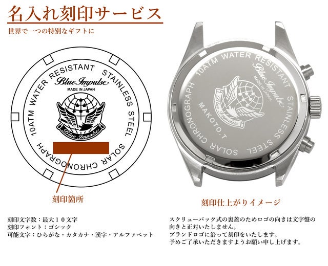 ブルーインパルス特別仕様モデルをより特別なギフトにしていただくため、名入れ刻印の追加オプションをご用意しました。名入れギフトは世界でたった一つのプレゼントになり、一生の思い出の品となります。思い出とともにこの腕時計が特別なパートナーとなることでしょう。