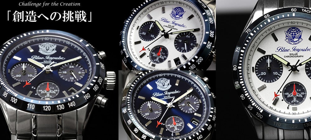 青と白、そして日の丸の赤がカラーリングされた美しいブルーインパルスの機体をイメージしたデザイン。コックピットをイメージしたクロノグラフ、そして大空を自由自在に飛行する姿から、太陽の光をパワーに変えて時を刻むソーラー電池を採用。ブルーインパルスの魅力が余すところなく凝縮された腕時計となっております。