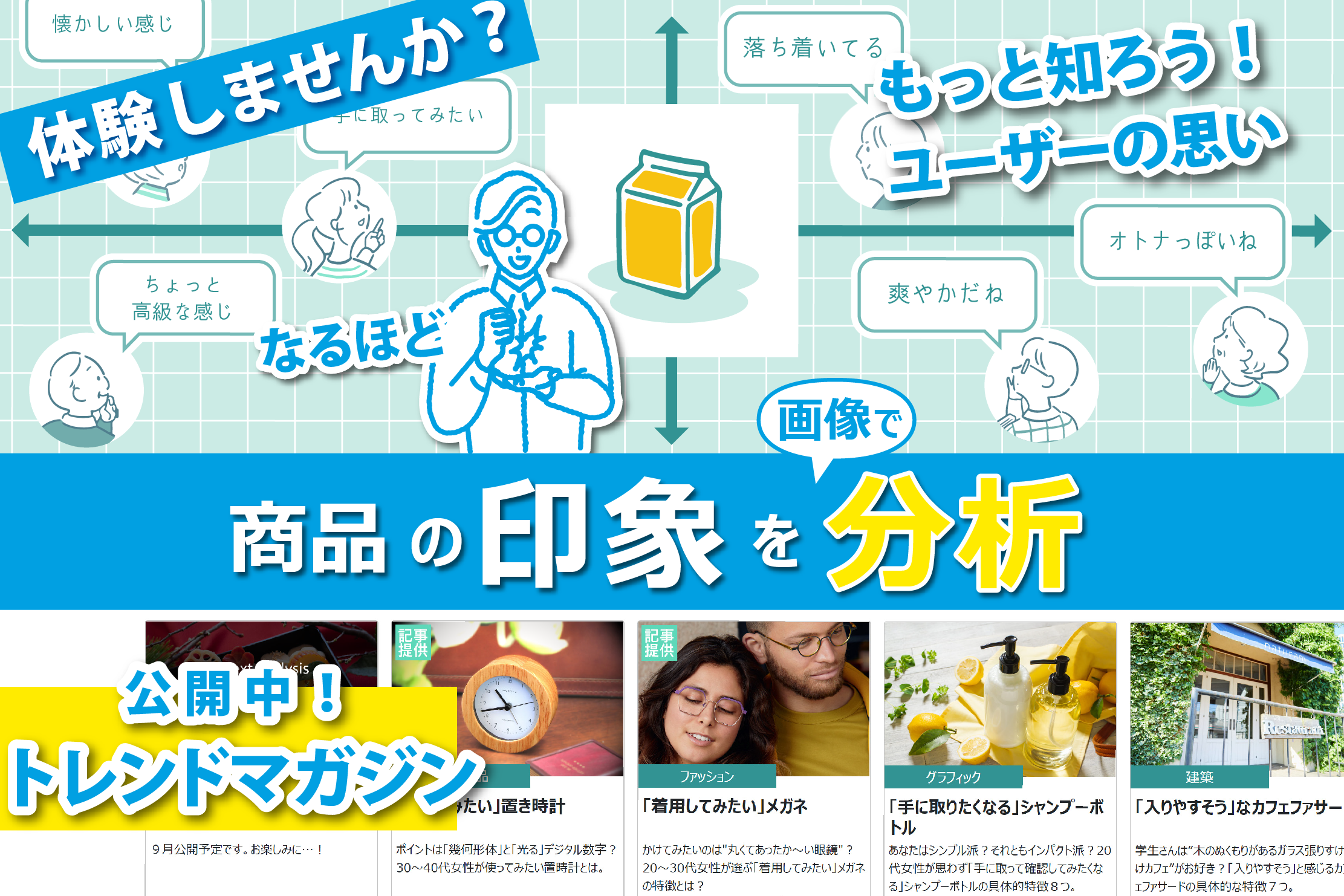 私たちは、本サービスの分析で「商品の印象」と「ユーザーの思い」のトレンドを調べることの面白さや、分析結果がビジネスなどで役立つ新しいヒントとなる事を広く知って頂くために、サイト内にある「トレンドマガジン」を通して調査分析の記事を定期的に発信しています。
