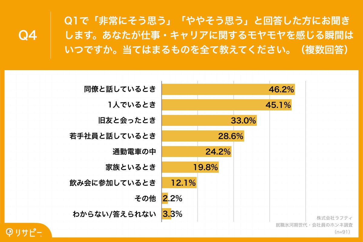 Q1で「非常にそう思う」「ややそう思う」と回答した方に、「Q4.あなたが仕事・キャリアに関するモヤモヤを感じる瞬間はいつですか。当てはまるものを全て教えてください。(複数回答)」(n=91)と質問したところ、「同僚と話しているとき」が46.2%、「1人でいるとき」が45.1%、「旧友と会ったとき」が33.0%という回答となりました。