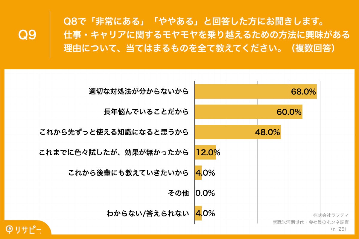 Q8で「非常にある」「ややある」と回答した方に、「Q9.仕事・キャリアに関するモヤモヤを乗り越えるための方法に興味がある理由について、当てはまるものを全て教えてください。(複数回答)」(n=25)と質問したところ、「適切な対処法が分からないから」が68.0%、「長年悩んでいることだから」が60.0%、「これから先ずっと使える知識になると思うから」が48.0%という回答となりました。