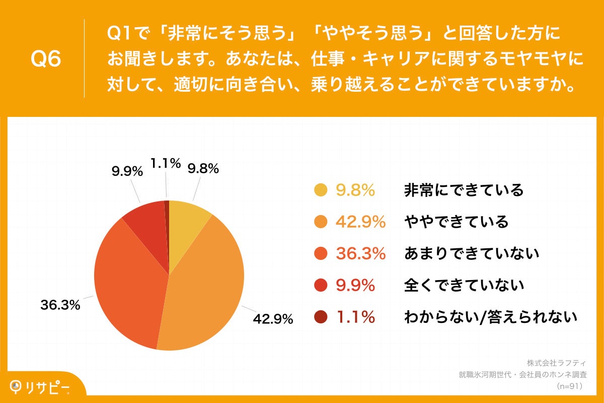 Q1で「非常にそう思う」「ややそう思う」と回答した方に、「Q6.あなたは、仕事・キャリアに関するモヤモヤに対して、適切に向き合い、乗り越えることができていますか。」(n=91)と質問したところ、「あまりできていない」が36.3%、「全くできていない」が9.9%という回答となりました。