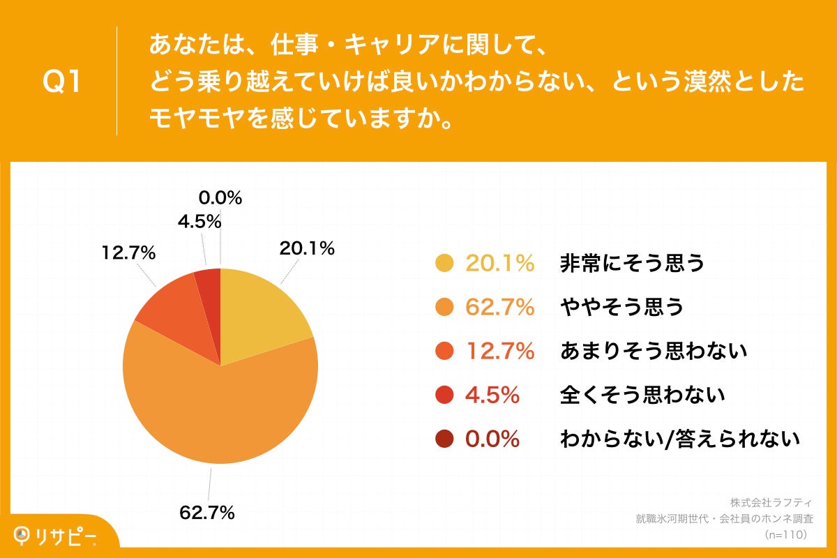 「Q1.あなたは、仕事・キャリアに関して、どう乗り越えていけば良いかわからない、という漠然としたモヤモヤを感じていますか。」(n=110)と質問したところ、「非常にそう思う」が20.1%、「ややそう思う」が62.7%という回答となりました。
