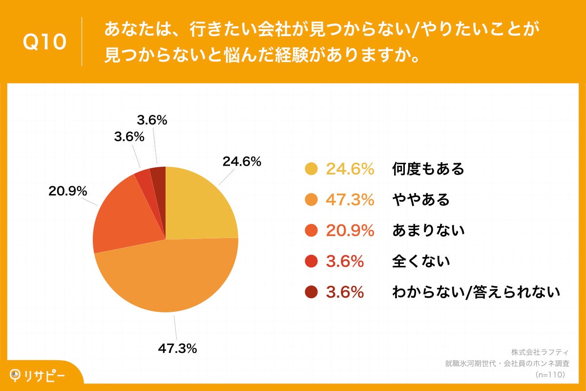「Q10.あなたは、行きたい会社が見つからない/やりたいことが見つからないと悩んだ経験がありますか。」(n=110)と質問したところ、「何度もある」が24.6%、「ややある」が47.3%という回答となりました。