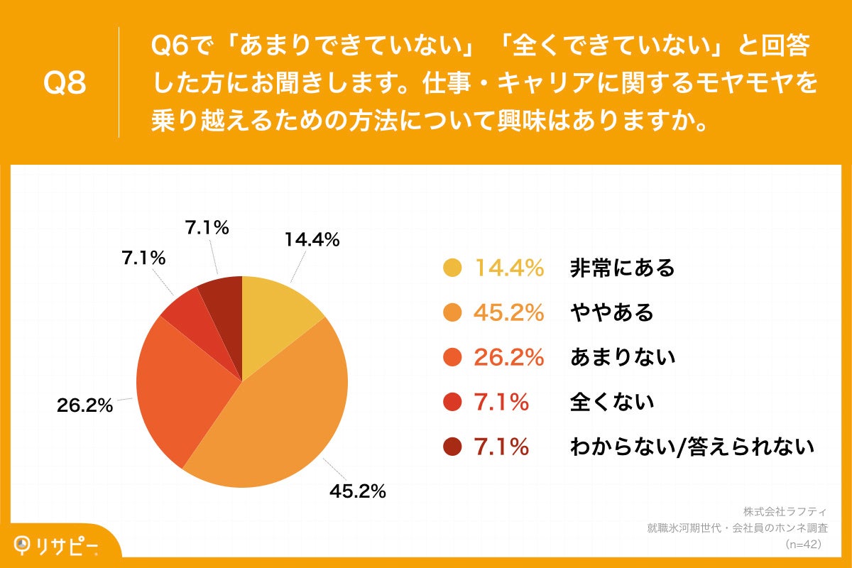 Q6で「あまりできていない」「全くできていない」と回答した方に、「Q8.仕事・キャリアに関するモヤモヤを乗り越えるための方法について興味はありますか。」(n=42)と質問したところ、「非常にある」が14.4%、「ややある」が45.2%という回答となりました。