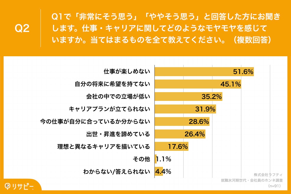 Q1で「非常にそう思う」「ややそう思う」と回答した方に、「Q2.仕事・キャリアに関してどのようなモヤモヤを感じていますか。当てはまるものを全て教えてください。(複数回答)」(n=91)と質問したところ、「仕事が楽しめない」が51.6%、「自分の将来に希望を持てない」が45.1%、「会社の中での立場が低い」が35.2%という回答となりました。