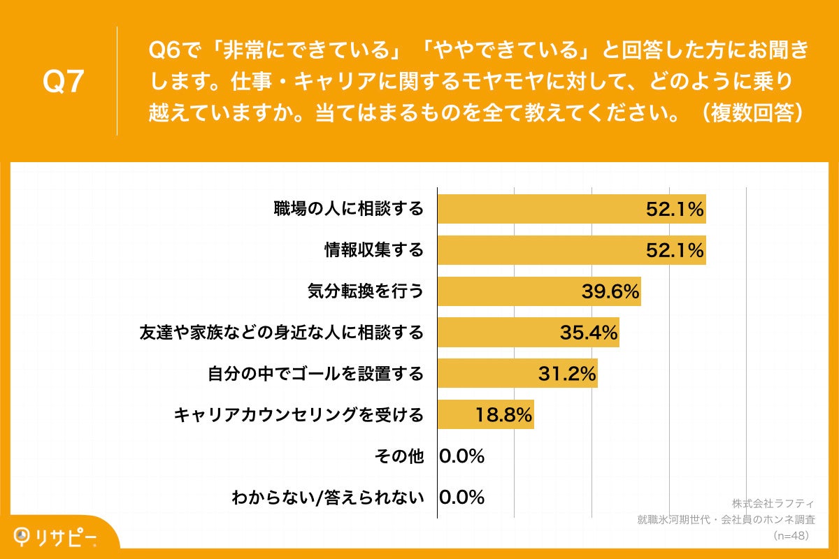 Q6で「非常にできている」「ややできている」と回答した方に、「Q7.仕事・キャリアに関するモヤモヤに対して、どのように乗り越えていますか。当てはまるものを全て教えてください。(複数回答)」(n=48)と質問したところ、「職場の人に相談する」が52.1%、「情報収集する」が52.1%、「気分転換を行う」が39.6%という回答となりました。