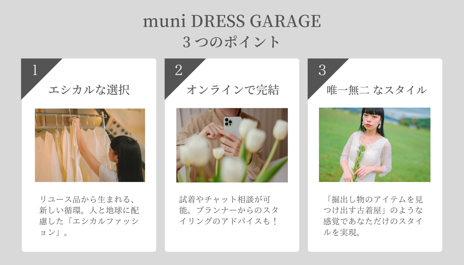 - 「muni DRESS GARAGE」3つのポイント
