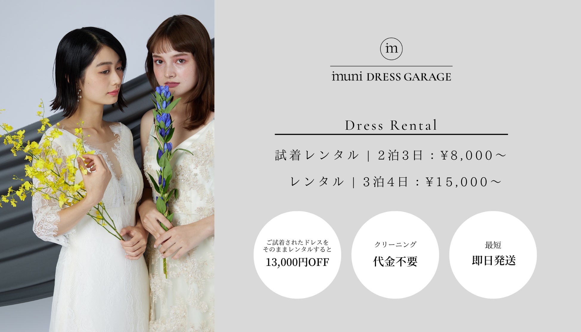 「 muni DRESS GARAGE(ムニ ドレスガレージ)」は、ウエディング業界の忙しいトレンド変化に伴い消費されていくドレスやスーツに着目し、リユース品をスタイリングによって唯一無二にするドレスレンタルブランドです。