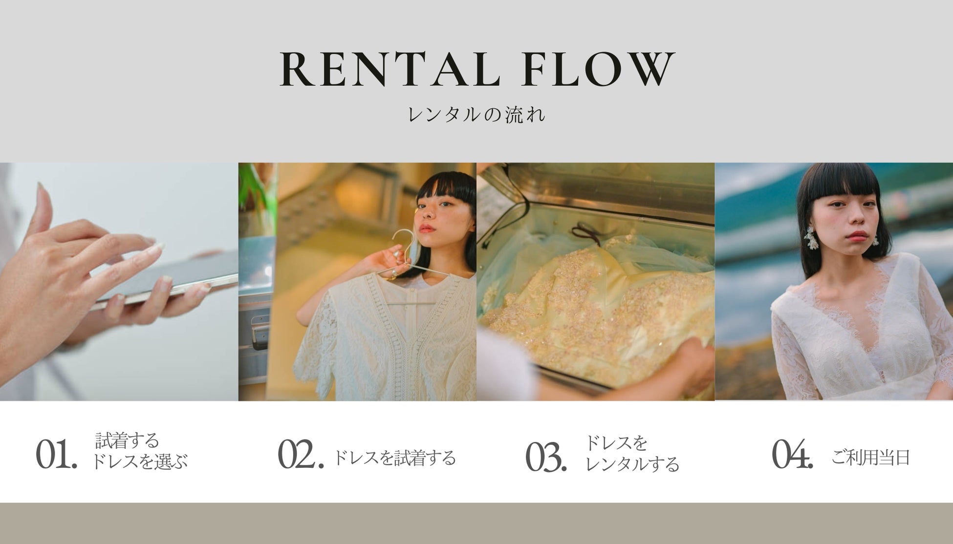 ショップを持たないブランドならではの価格帯で、どこよりも利用しやすいレンタルサイトを目指しています。ウエディングシーンで生み出された衣装の数々を買い取り、ECサイトでのレンタルを行います。