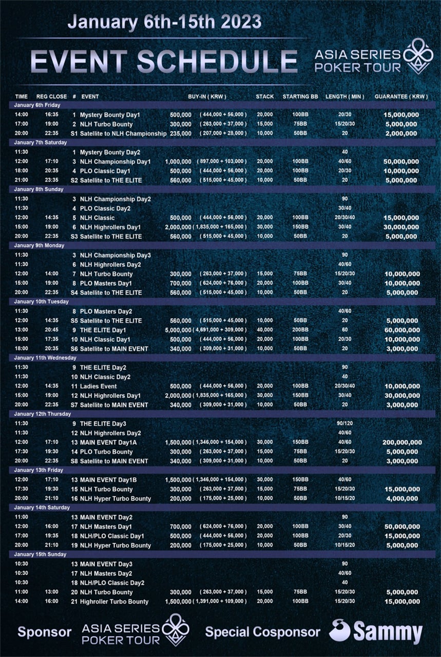 その記念すべき第1回大会 ”ASPT Korea 2023” が、2023年1月6日(金)~1月15日(日)の計10日間、韓国のParadice Cityカジノ内で開催される。注目すべきメインイベントの賞金総額は3億KRW(3000万円)を超え、大会全体では総額10億KRW(1億円)を超える見込みだ。