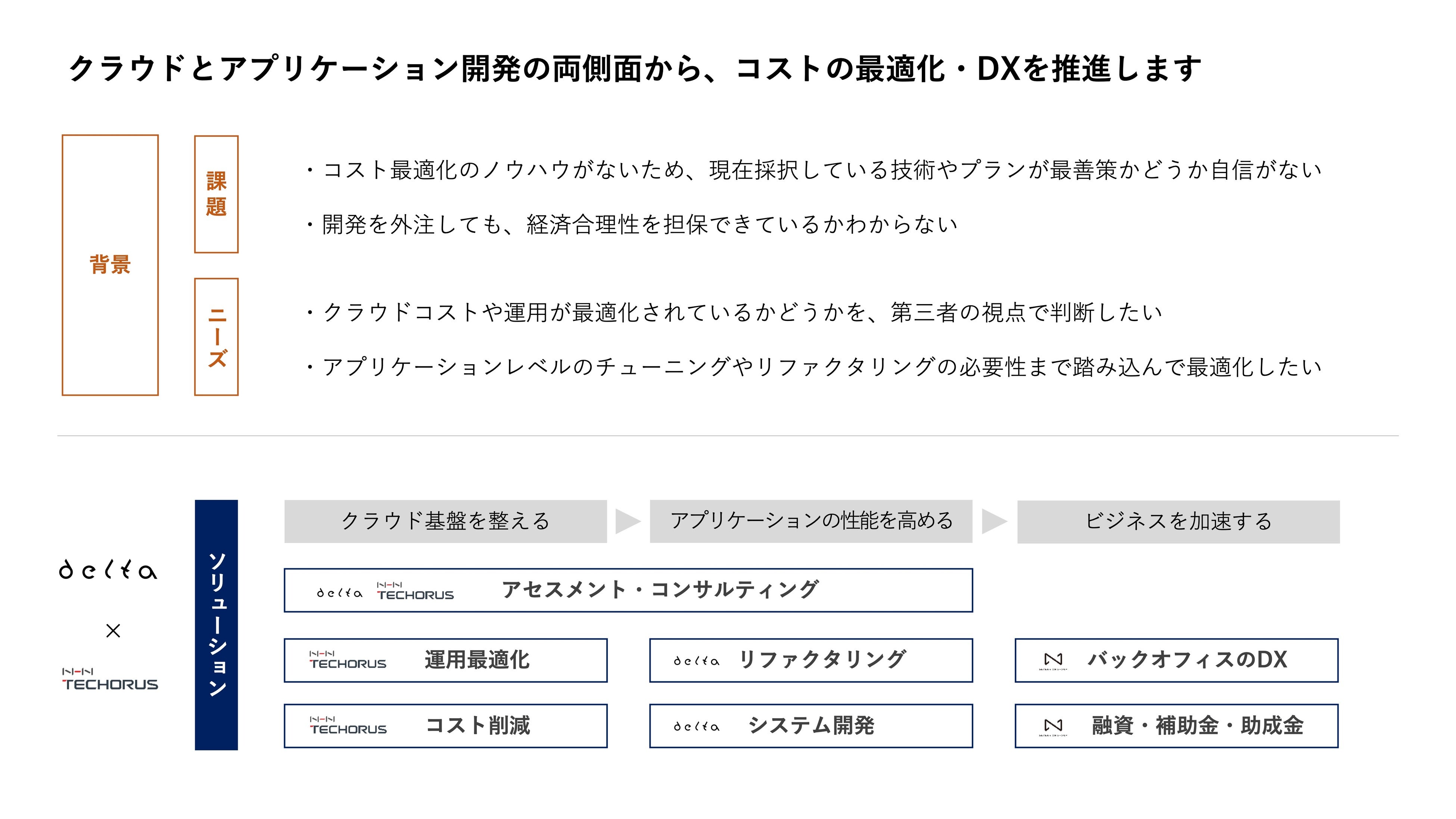 このような課題とニーズに対しては、アプリケーションとインフラ両面からの診断と最適化が必要です。そこで、DELTAとNHN テコラスが提携して以下を行い、クラウドコストも踏まえた企業の総合的な経済合理性を高めることを目指します。