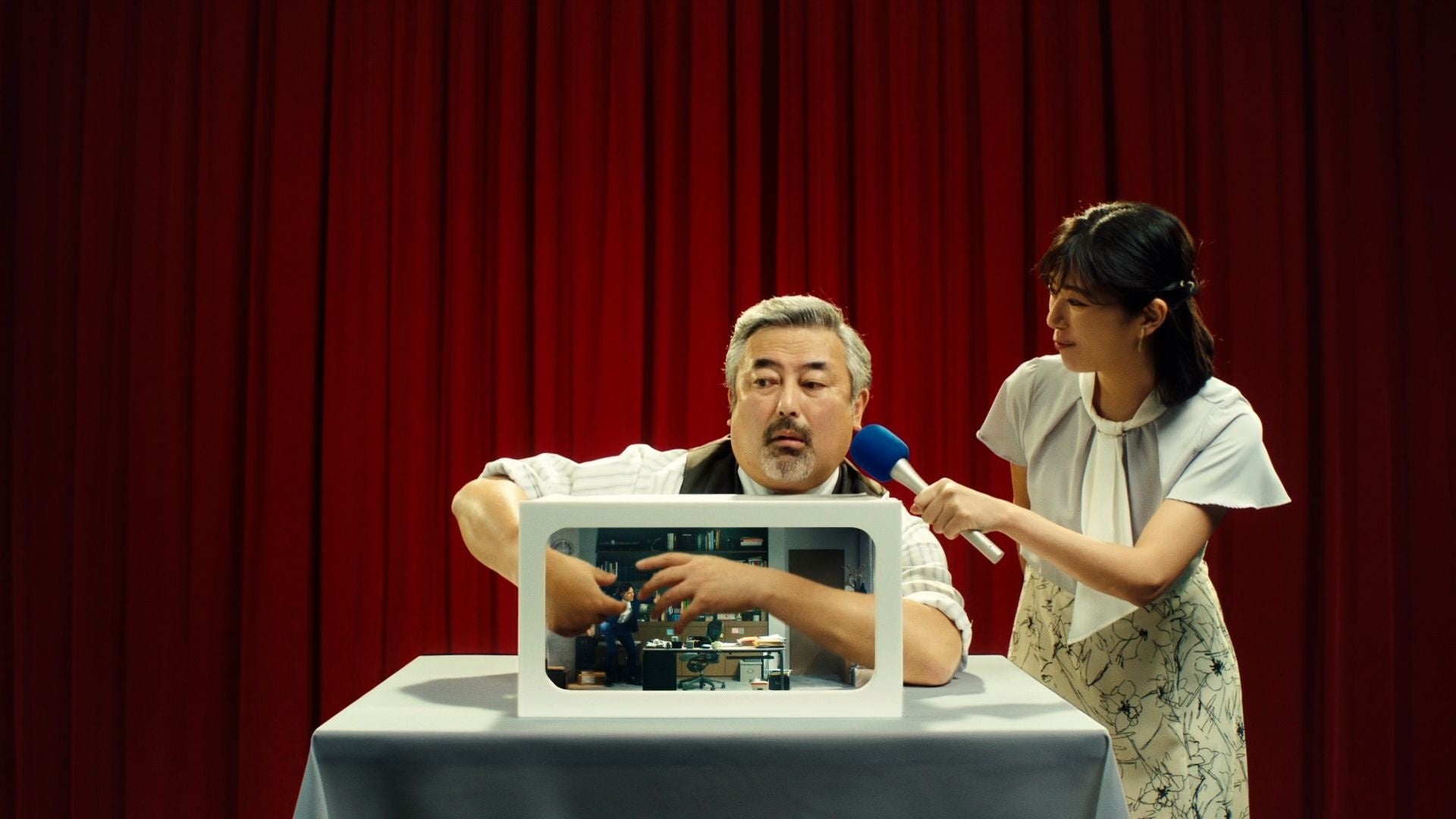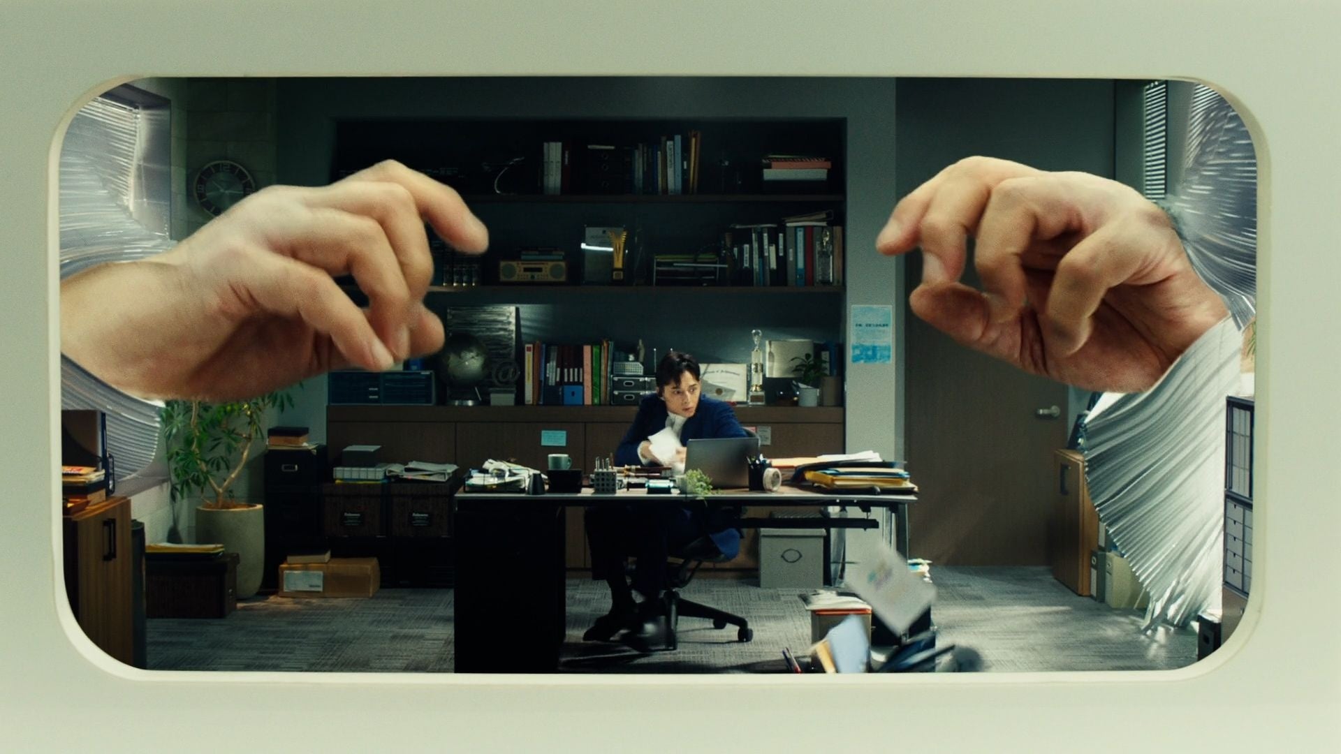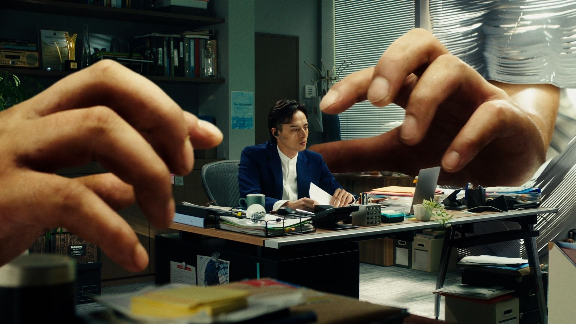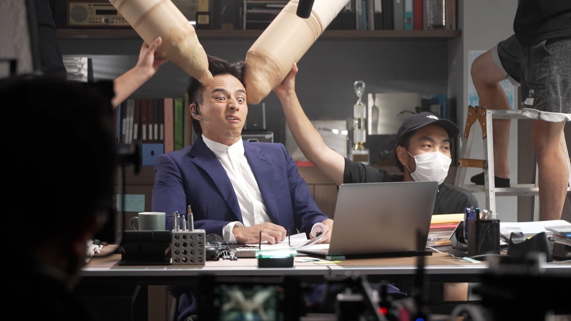 満島さんのリモート会議中に窓の外から突如現れる巨大な謎の手との撮影ですが、撮影後には合成で仕上げるため、実際は、小道具などを使用しての撮影となりました。指に見立てた棒が満島さんの顔を挟んだり、体を突いたり、髪の毛をかき乱したりと好き勝手に動く中、その場にはない手の動きを想像しながら、表情やジェスチャーで完璧に表現する満島さんの演技に現場からも「すごい」という声が上がりました。想像力を最大限に働かせて演じる満島さんの演技にご注目ください。