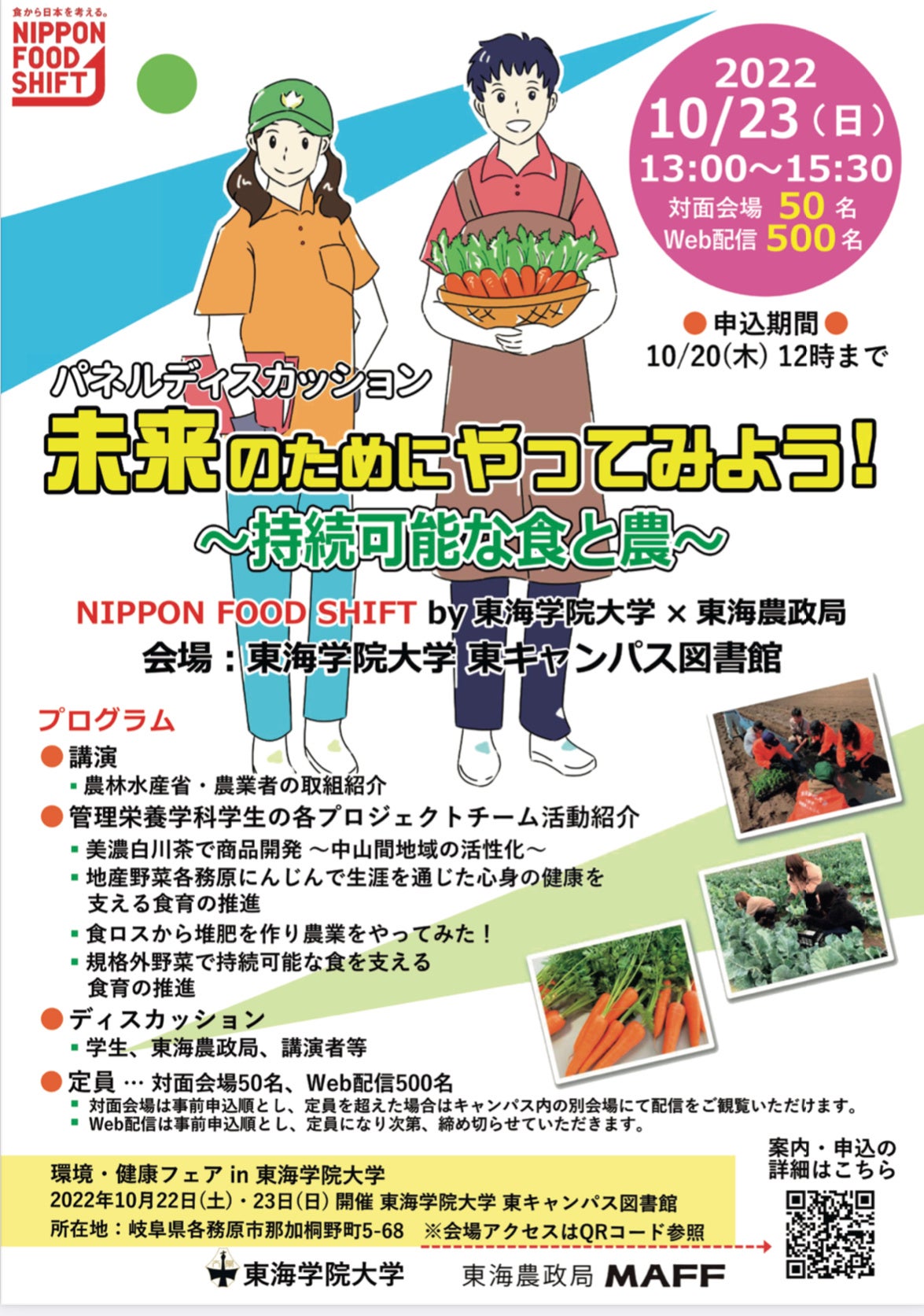 東海農政局は、東海学院大学とタイアップし、「持続可能な食と農」をテーマにパネルディスカッションを開催します。