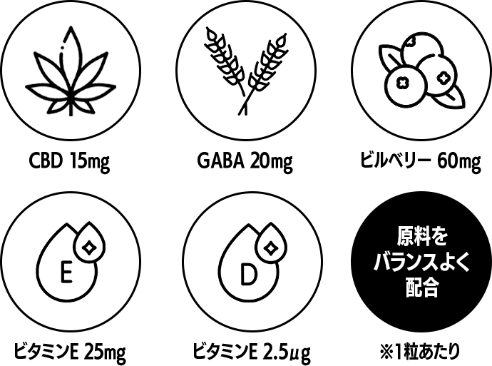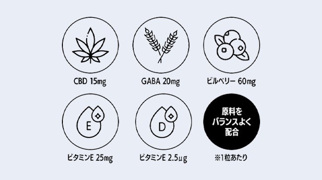 マインドフルネスにいい欧米で人気の成分"CBD"に加え、寝る前のくつろぎをサポートする成分"GABA"、クリアで快適な毎日を応援する「アントシアニン」を多く含む"ビルベリー"、健康づくりに必要な栄養素"ビタミンE"、外出機械が少ない方におすすめの成分"ビタミンE"など、5つの材料を厳選しています。
