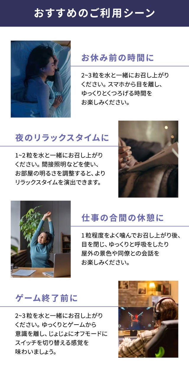 ココロとカラダにスローな日常を。毎日が忙しいと感じる人のオンとオフの切り替えに寄り添う、デジタルウェルビーイングに着目したCBD配合のウェルネスサプリメントです。