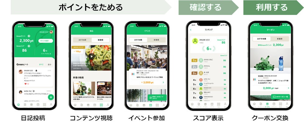 本実証実験で活用するスマホアプリは、富士通が独自に開発したもので、実証参加者へのポイント付与および管理をはじめ、ポイントをスコア化してランキング表示する機能、日々の環境行動を記録し参加者同士で共有する機能、参加者一人ひとりの属性に応じたコンテンツ・キャンペーン・イベント情報を配信するレコメンド機能を備えています。