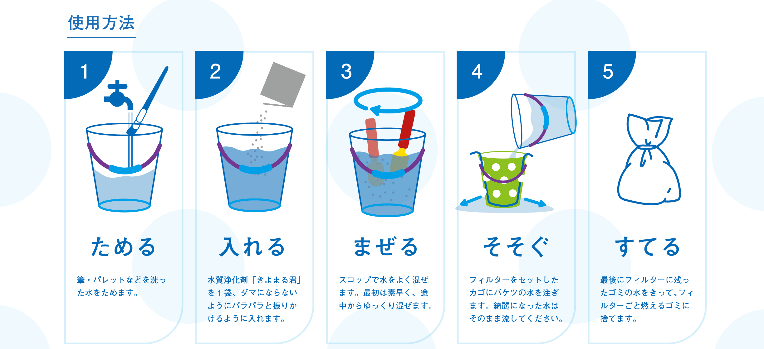 現在多くの学校では筆を洗った黒い水をそのまま流すのは環境に悪く、また服や洗い場が汚れると思いながらも排水口に流しておられます。また学校によってはお子さんたちに筆を家に持って帰らせ各家庭で洗って持ってくるように指導しており、服や洗面所が汚れるなど同様の問題は家庭内でも起こっております。しかし一般の方は「捨てる他に方法ないしどうしようもない…」と思っておられたと思います。そこで我々が普段企業様に使って頂いている水質浄化剤『きよまる君』を一般の方にも簡単に安全に使っていただくために、誰でも簡単にきれいな水を!排水処理セット『くるくる水クリン』 『シャカシャカ水クリン』 を開発し、販売・ご提供できるようになりました。