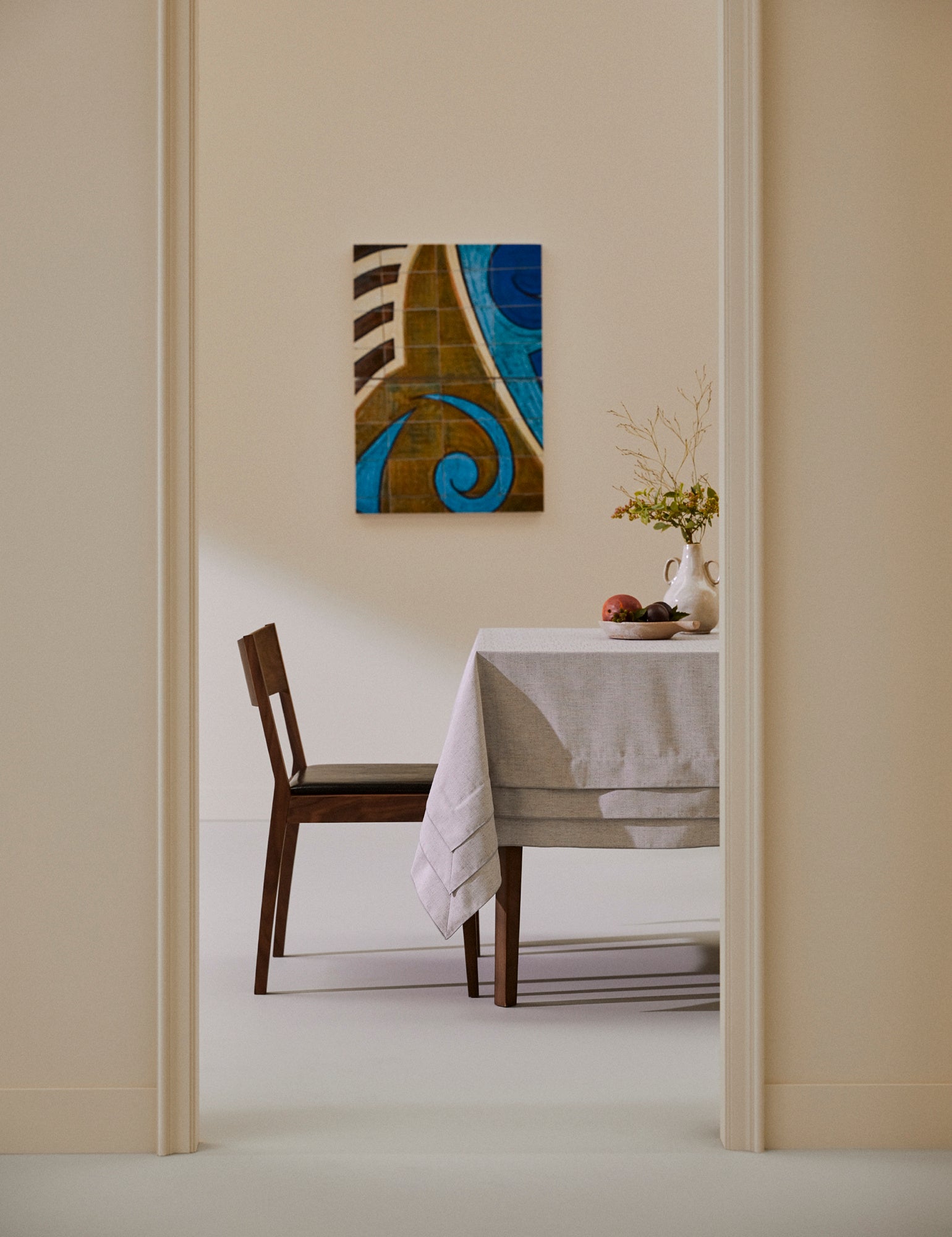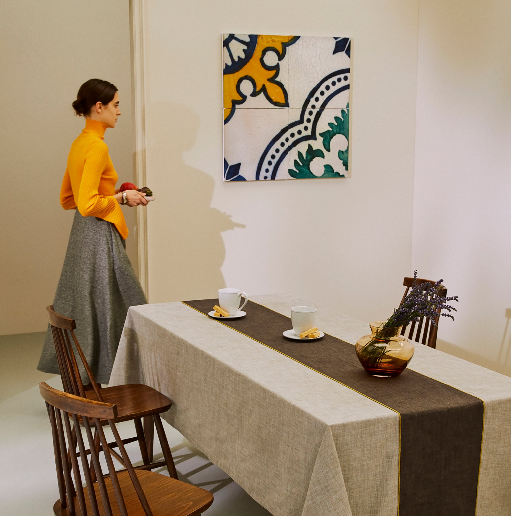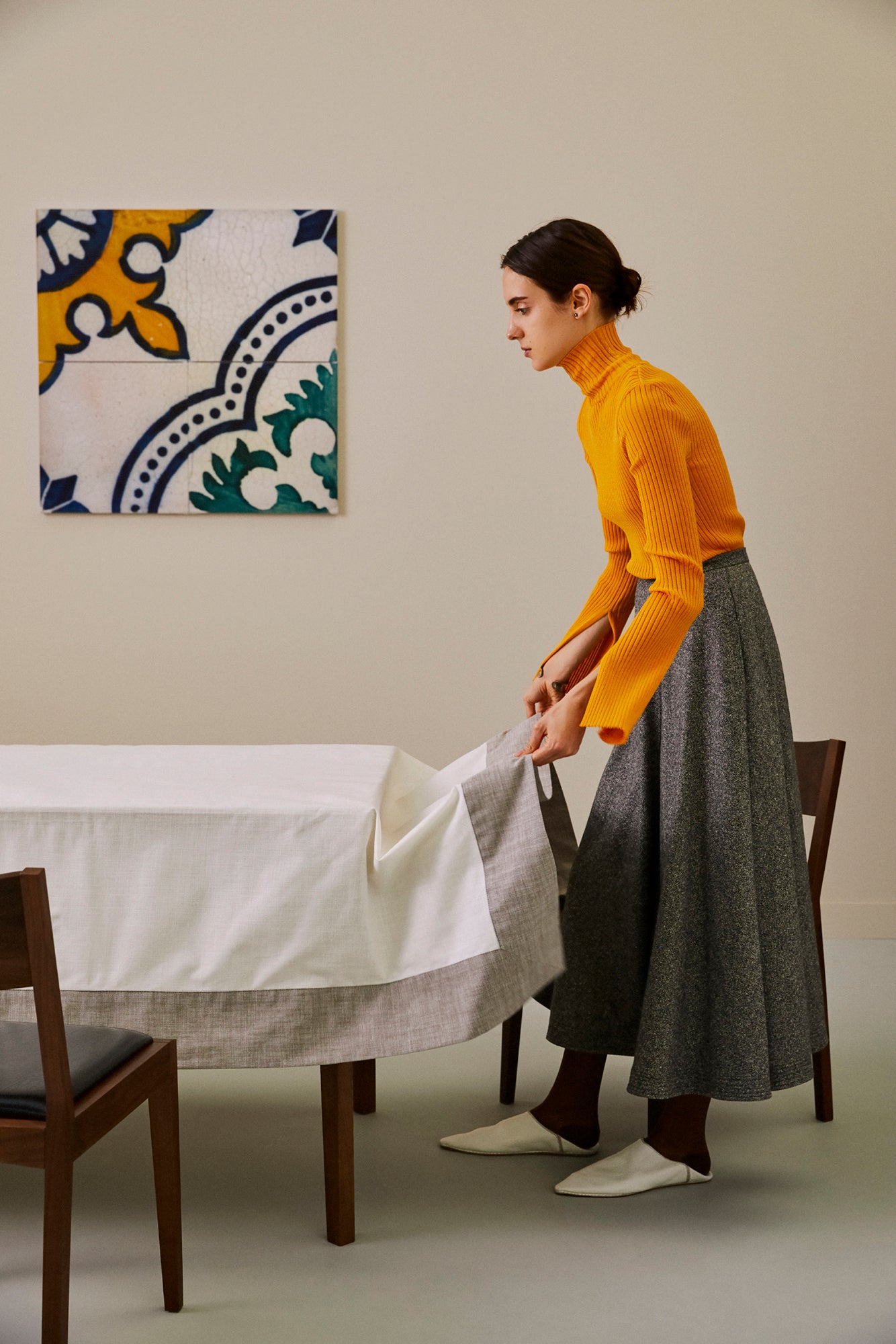 ファーストコレクションは2022年10月6日よりeterbleの公式オンラインストアにて販売を開始します。ファーストコレクションは、クリエイティブ・ディレクターの葉山泰子がNY在住中に触れたスペインやポルトガルのアートからインスパイアされ、自立した女性のライフスタイルをイメージして作られました。大西洋に落ちる美しくもなぜか少し物哀しいサンセットの色彩や、その夕陽を浴びた建築物と草花たちの陰影が、クロスの少し褪せた色使いや幾何学模様で表現されています。今コレクションのシグニチャーモデルでもある「eterble fabric」を使用した3段タックのテーブルクロスは、一見シンプルでありながらそれだけで魅せることができる独立性を追求。気の利いた女性が想う遊び心とちょっとした特別感の表現を目指しました。厳選されたサステナブルコットンを使用した切り替えしのあるテーブルクロスでは、シックで様々なシーンに馴染む印象を持たせながらさりげないブロードの刺繍を施してあり、ポルトガルのサンセットビーチの水面に映る光の輝きをイメージしています。記念日、友人を招いてのホームパーティや、日常を少し特別なものにするために、eterbleのテーブルクロスは食卓を満ち足りた風景へと描き、食卓からあなたを新しい世界へと誘います。