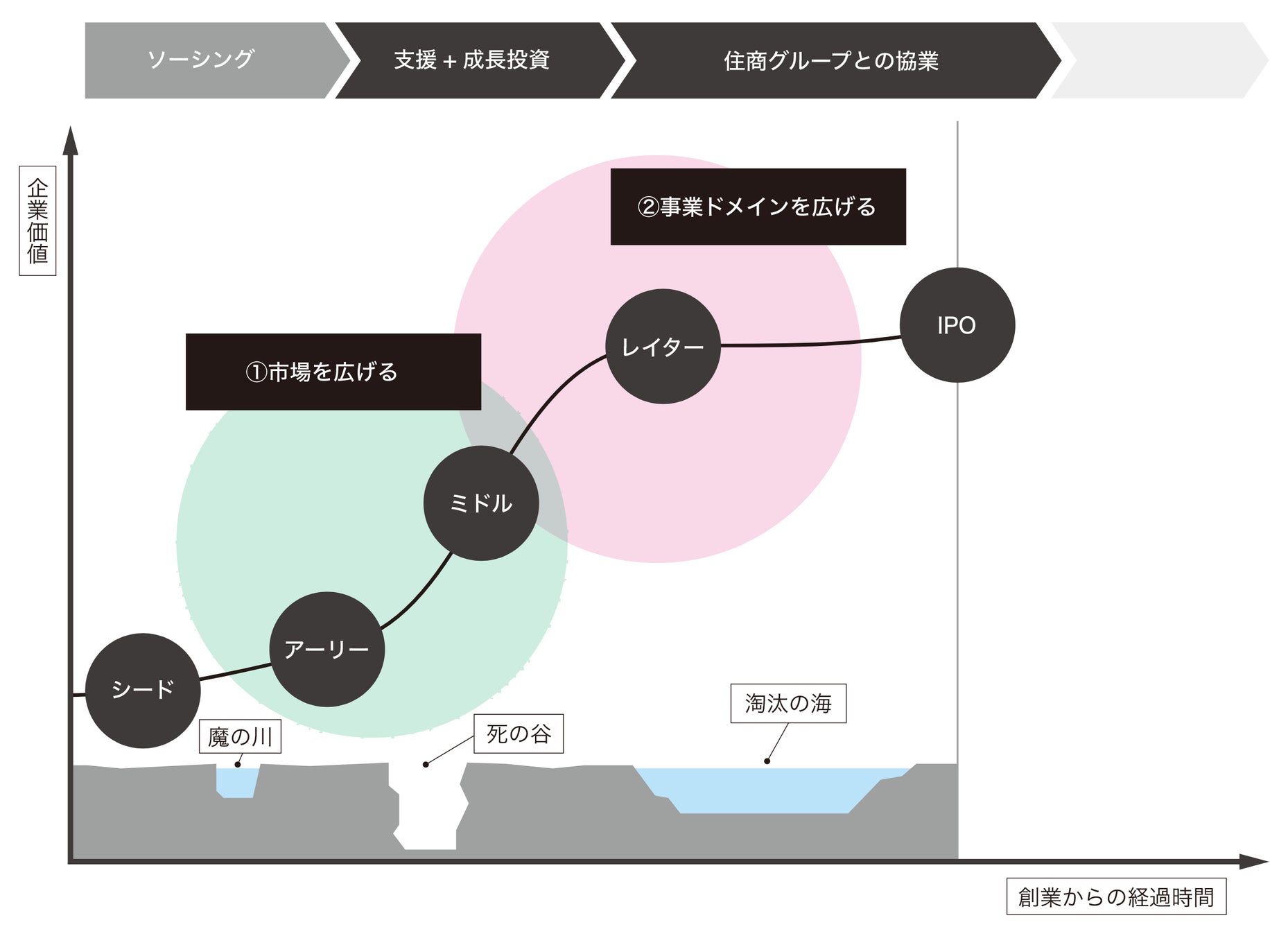 ・市場を広げる:住友商事のアセット・リソースを活用し、スタートアップの既存事業の拡販から海外展開まで支援していきます。