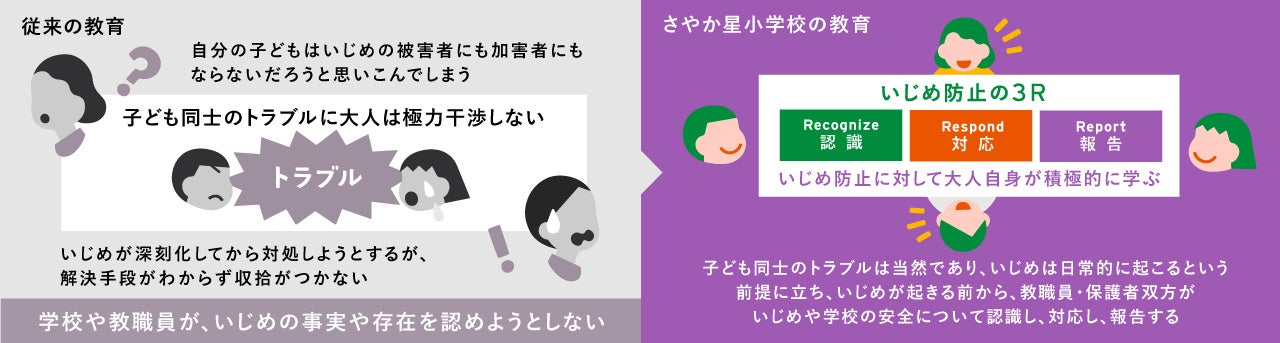いじめ防止の3Rプログラムとは、いじめの問題を大人の問題として捉え、未然に防ぐために大人が取るべき行動の「3R:Recognize(認識)、Respond(対応)、Report(報告)」を浸透させるべく、すべての教職員・保護者向けに提供されるプログラム。適切な対応を知らないがゆえに、いじめを放置してしまう大人を減らすためにも、「いじめは常に発生しうるもの。すべての教職員・保護者双方で普段から見守っていこう」という支援を呼びかけていきます。