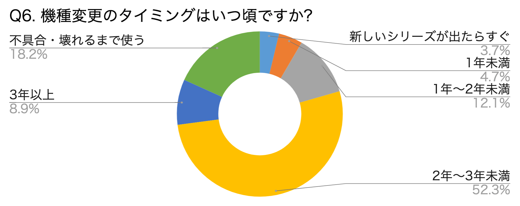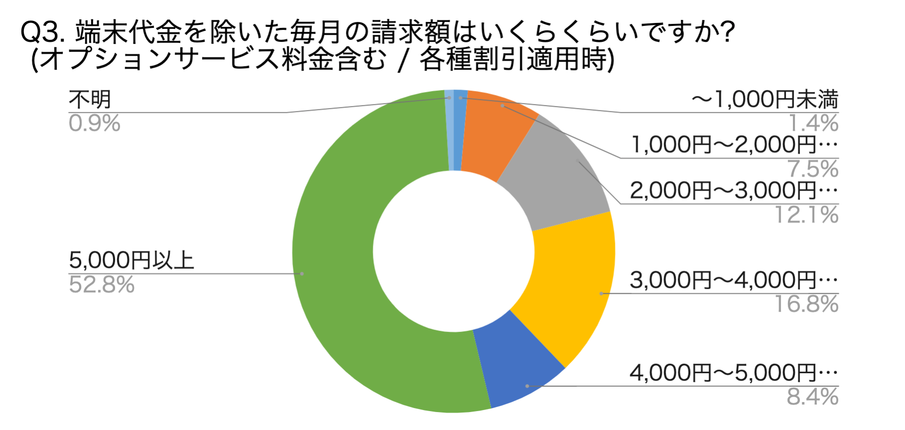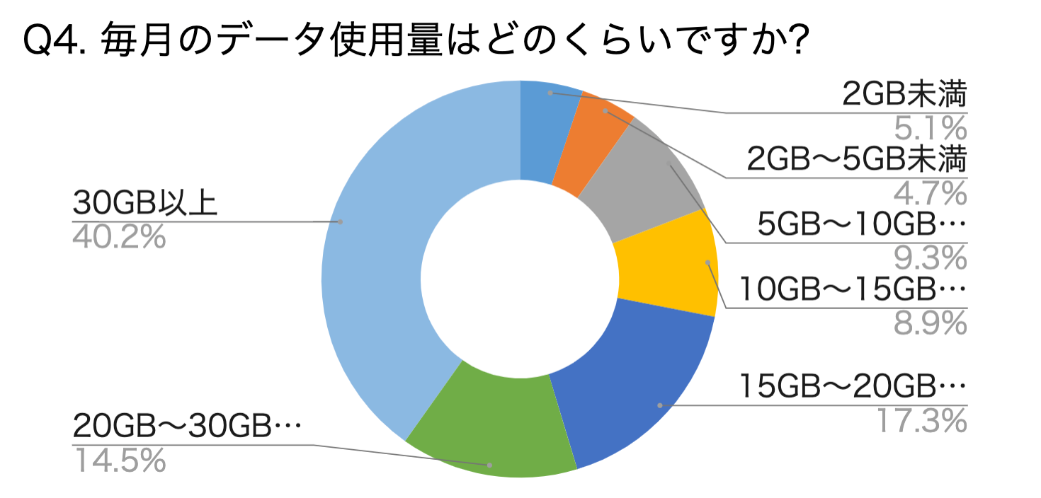 20GBのデータ容量プランは、格安SIM会社やオンライン専用プランであれば、月額3,000円未満(オプションを付けても4,000円未満)で利用可能。しかしながら、Q3のグラフでは、請求額4,000円未満の方は全体の約38%という結果が出ているため、最低でも7%の方々が、格安SIM会社やオンライン専用プランを利用しないことで損をしています。