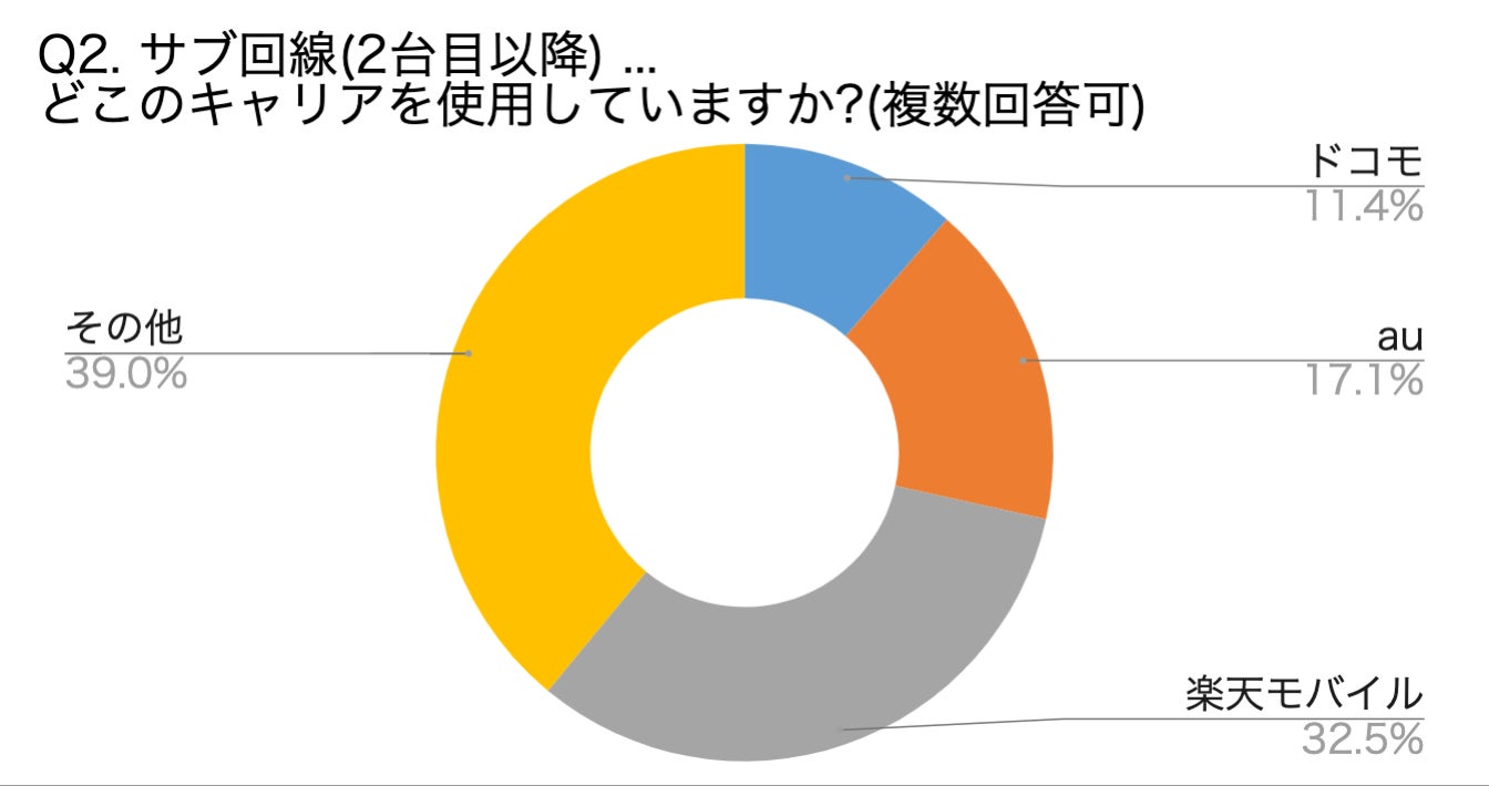 サブ回線(2台目)を所有している人は、全体の約53%。そのうち最も使用率が高いのは楽天モバイルで32.5%、2位がauで17.1%、3位がドコモで11.4%という結果になりました。楽天モバイルの使用率が高いのは、2022年6月まで提供していた月額料金0円(1GBまで)のプランが、サブ回線に最適だったためだと考えられます。
