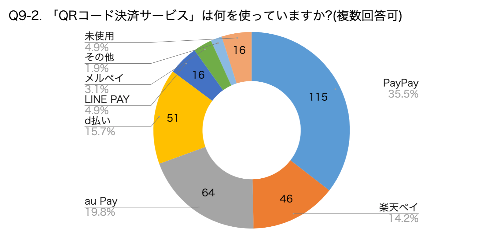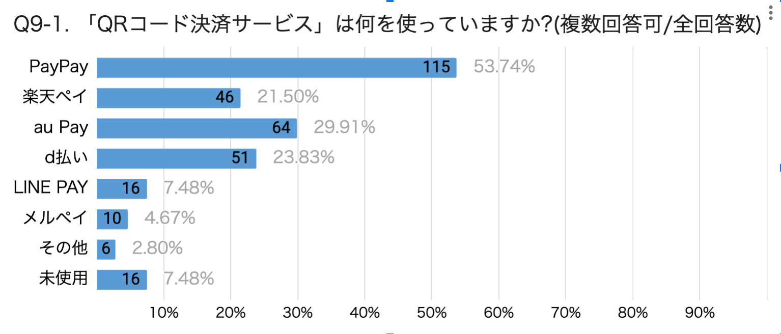 Q9.の利用しているQRコード決済についての質問では、回答者の2人に1人がPayPayを利用していることがわかりました。次いで利用者の多いサービスは、au PAY(29.9%)、d払い(23.8%)、楽天ペイ(21.5%)。