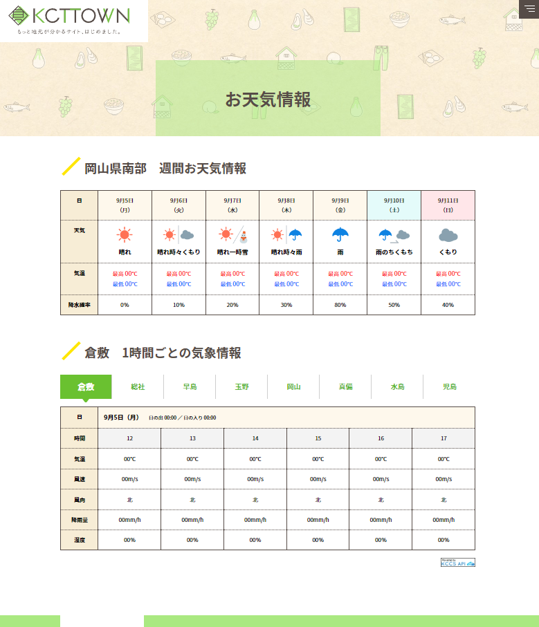 また、倉敷、総社、玉野、早島、水島、児島、真備、岡山の地元8エリアの個別気象情報をお届けする天気ページも開設します。