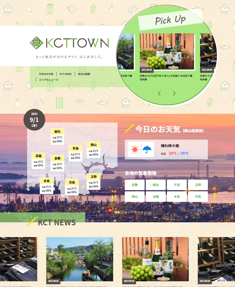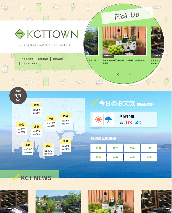 「KCTタウン」では倉敷ケーブルテレビが独自取材したKCTニュースのほか、地元生活情報や地元に関連する話題などを一つのサイトにまとめてお届けします。