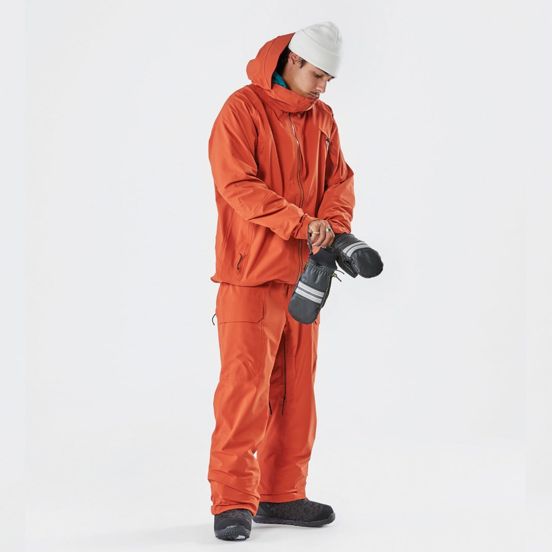 スノーボードなどでバックカントリーへ行くことを念頭に置いて細部までデザインされたJKTは全てシームレス加工。防水性、ストレッチ性の高い素材を使用し、緻密なカットにより軽量化も実現しています。1つのジッパーでサイドベンチレーションとポケットを兼用させるなど機能性を追求するなど、ミニマルなデザインの中にもこだわりがふんだんに詰まったブランドを象徴するモデルです。ペアとなるBIBパンツも同じく透湿性と防水性に優れた軽量でストレッチ性のある3レイヤー素材を使用。CORDURA製のサイドパネルは非常に柔らかく、登りでも滑りでもスムーズに動けるようにデザインされています。
