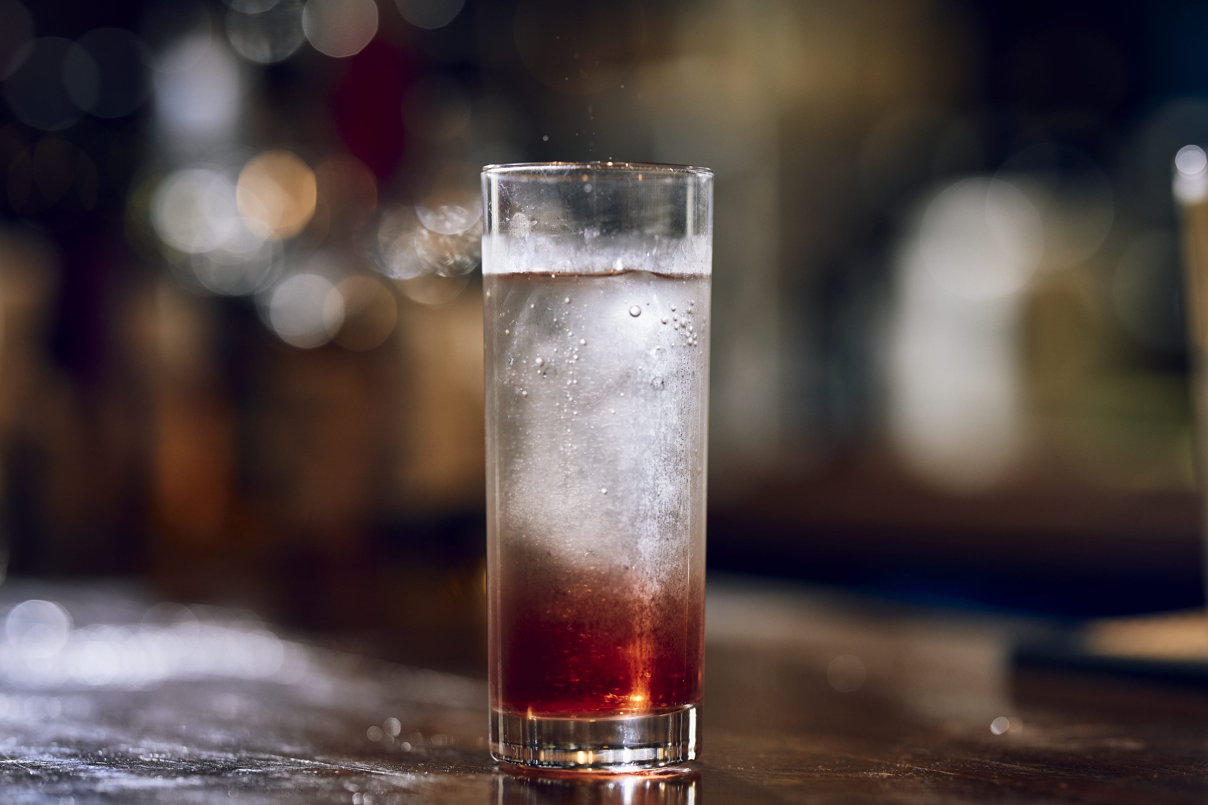 ※写真のように二層にしたい場合は、Beniにシロップを適量加えてよく混ぜてから氷を入れ、バースプーンをグラスの内側にくっつけて、MIYAKO GIN、ソーダの順にスプーンに液体を当てながら静かに注ぎます。飲むときにはしっかり混ぜてお召し上がりください。