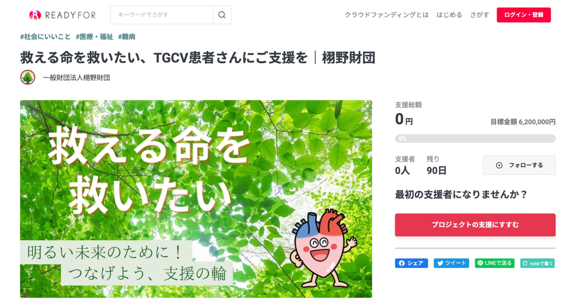 一般財団法人栩野財団(所在地:大阪府、代表:平野賢一)は、クラウドファンディングサービス「READYFOR」にて、TGCVの患者さんへの支援活動のために『救える命を救いたい、TGCV患者さんにご支援を|栩野財団』を公開しました。620万円を目標に、本日2023年6月27日(火)から9月25日(月)まで支援を募ります。