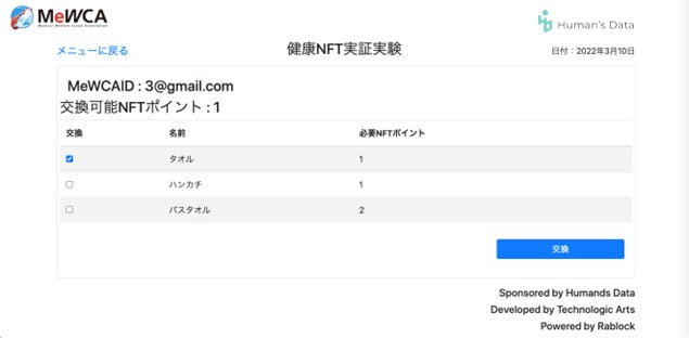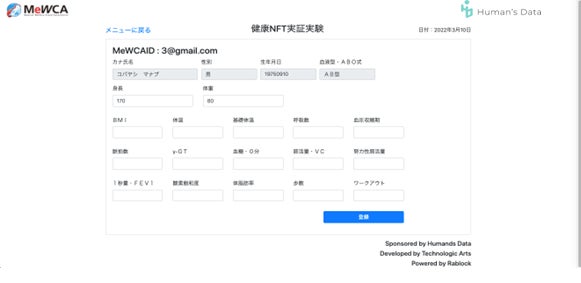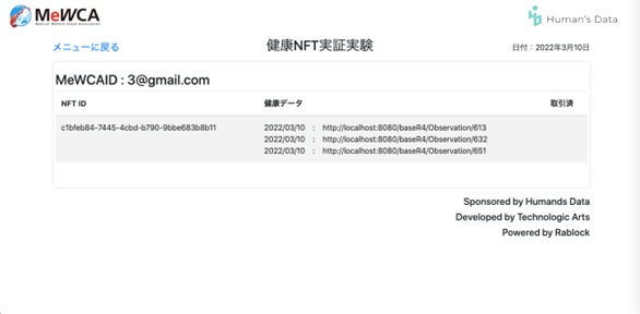 ヒューマンズデータ株式会社(本社:東京都千代田区、代表取締役CEO:長瀬嘉秀 以下ヒューマンズデータ)は、健康データのセキュアな状態で取引・利活用を目指し、特定非営利活動法人 医療福祉クラウド協会(本社:東京都文京区、理事長:御園慎一郎 通称MeWCA 以下医療福祉クラウド協会)およびラブロック株式会社(本社:東京都港区、代表取締役CEO:永田圭 以下ラブロック)と連携し、健康データのNFT化によるスマートコントラクトに関する実証実験を行いました。