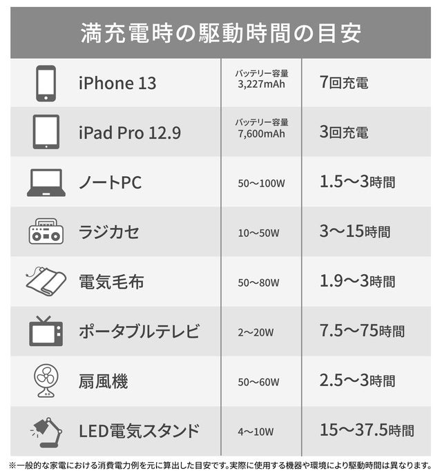 [内蔵電池]リチウムイオンバッテリー DCの場合30,000mAh(ACの場合10,000mAh)