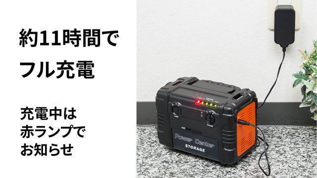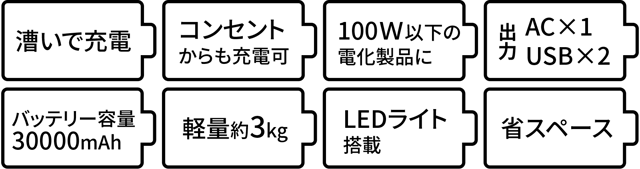 ためた電気でスマホやタブレットの充電をしたり、搭載されたLEDライトを灯りにしたり。防災グッズとして一家に一台あると心強いポータブル電源です。