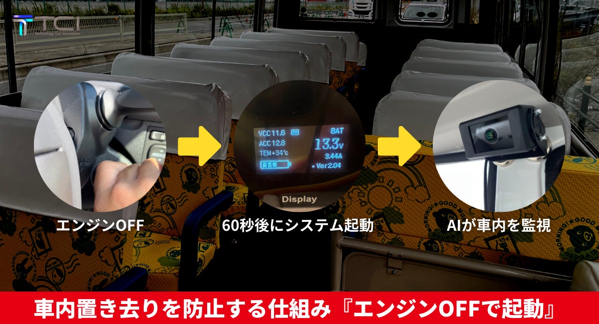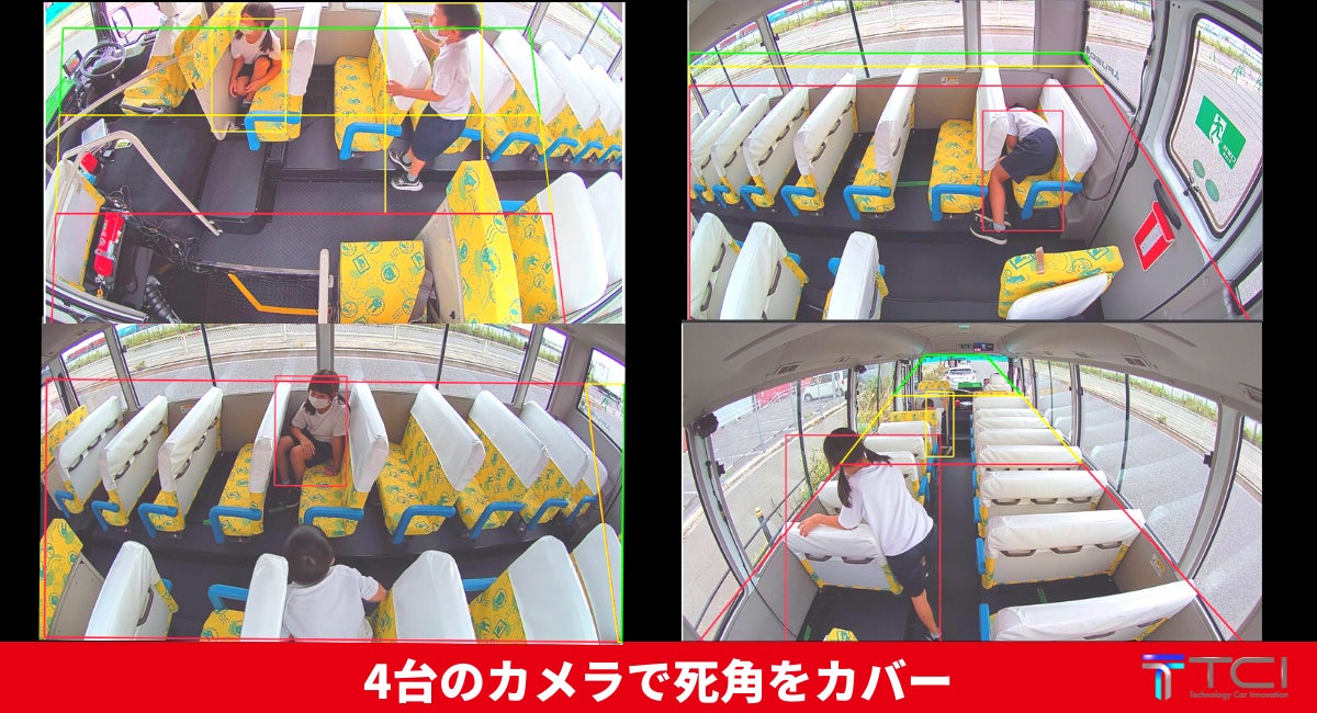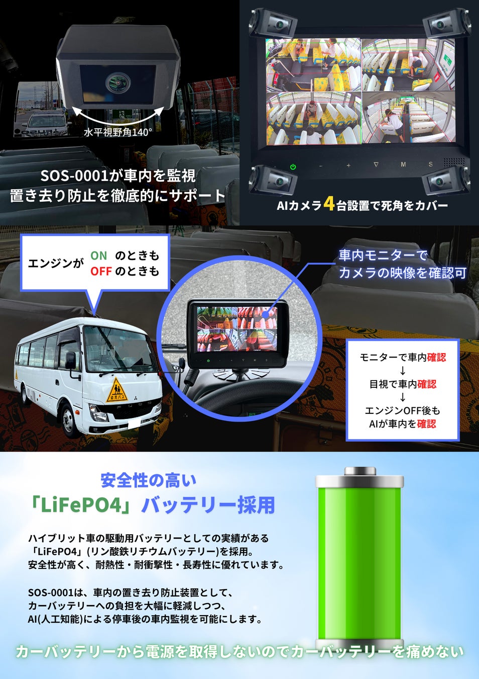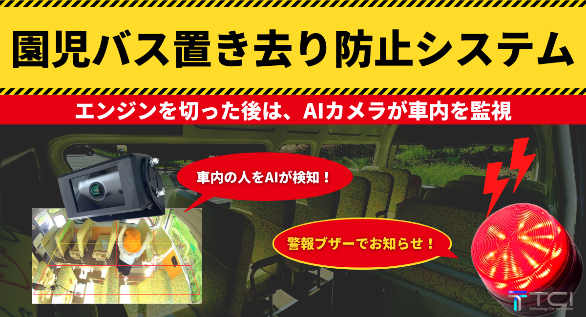 株式会社TCI(本社:大阪市淀川区、代表取締役:尾﨑俊行、以下「TCI」)はTCI独自で開発をしたバス車内置き去り防止装置(品番:SOS-0001)を2022年10月3日(月)に発売します。人間を自動で検知すると大音量ブザーで車外に警告音を発するAIカメラを車内に搭載し、車両のエンジンが停止した60秒後から起動するシステムにすることで、車内に取り残された人間を検知し、置き去りを防止する装置となっています。品番のSOSは、SYANAI(車内)のS・OKIZARI(置き去り)のO・SHINAIDE(しないで)のSを表しており、取り残された園児や生徒に代わってSOSを出すことを目的として命名。大手フォークリフトメーカーや大手重機会社などで導入されているTCIのAIカメラソリューションを独自に応用開発することで、置き去り防止対策の完全自動化を実現しました。