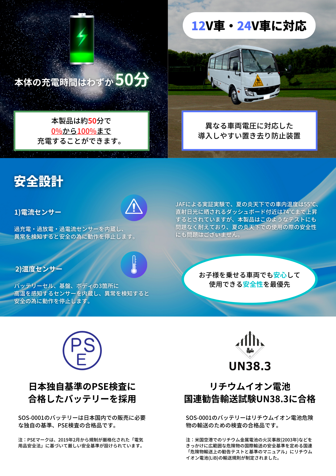 SOS seriesのバッテリーは日本国内での販売に必要な独自の基準、PSE検査の合格品です。