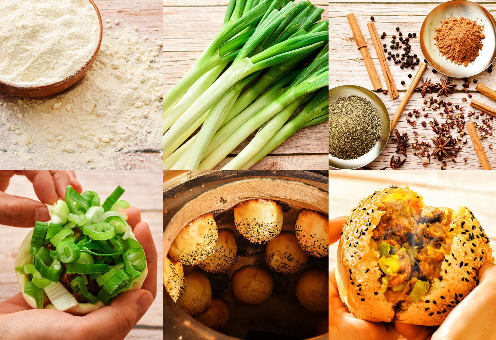 中華料理ではよく使われる 「五香粉」と「胡椒」で味付けした豚肉餡とネギを生地で包み、 胡椒餅専用の窯の内側に貼り付けて仕上げる独特の焼き方が特徴です。