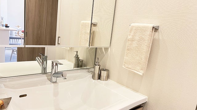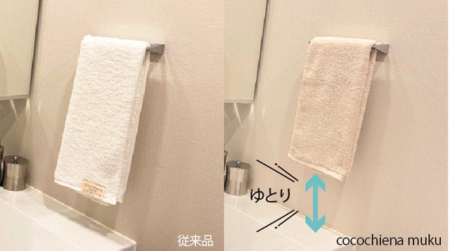 「cocochiena muku」のフェイスタオルは、「長さが65cm」と一般的なフェイスタオル約80cmより約15cm短い「ショートフェイスタオル」としてデビューさせることになりました。従来のフェイスタオルの長さでは、一般的なマンションの洗面所に備え付けてあるタオルかけにかけると長さがギリギリ、もしくはスレスレ、という課題を解決し、二つ折りでタオル掛けにかけると、ちょうど最適なバランスを生み出しました。洗面台との間にもいいゆとりが生まれ、空間にも美しい余白が生まれます。