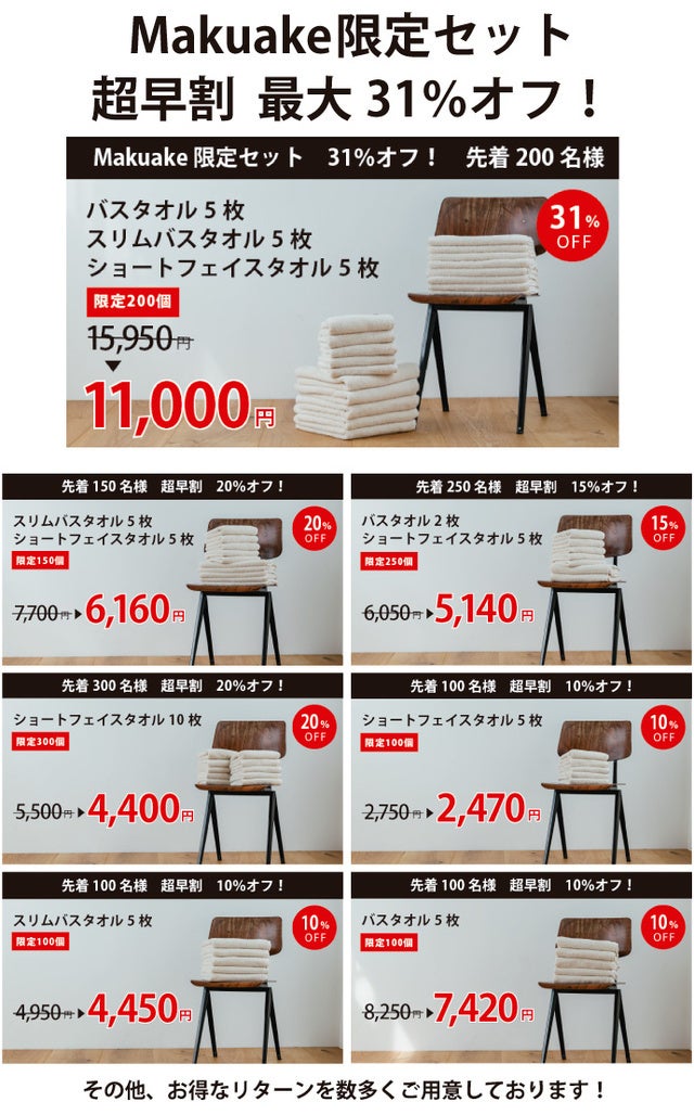 【Makuake限定セット】タオル3種類 計15枚セット 31%OFF / 11,000円など。 |