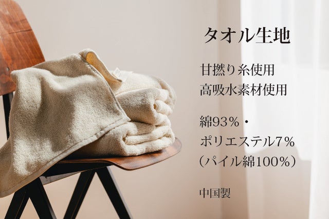 タオル生地は、甘撚り糸と高吸水素材を使用しています。綿の混合率は、綿93%・ポリエステル7%(パイル綿100%)で、製造は中国で行なっています。