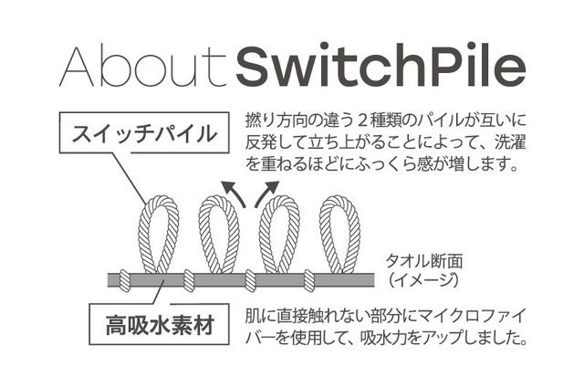 「cocochiena」シリーズで大変なご好評をいただいたスイッチパイル製造技法を用いたやわらかく、しなやかで、ボリューム感ある風合いはそのままに、タオル屋として、地球や未来、人や社会のために、今、私たちができる「身近なサスティナブル生活提案品」として皆さまにお届けいたします。