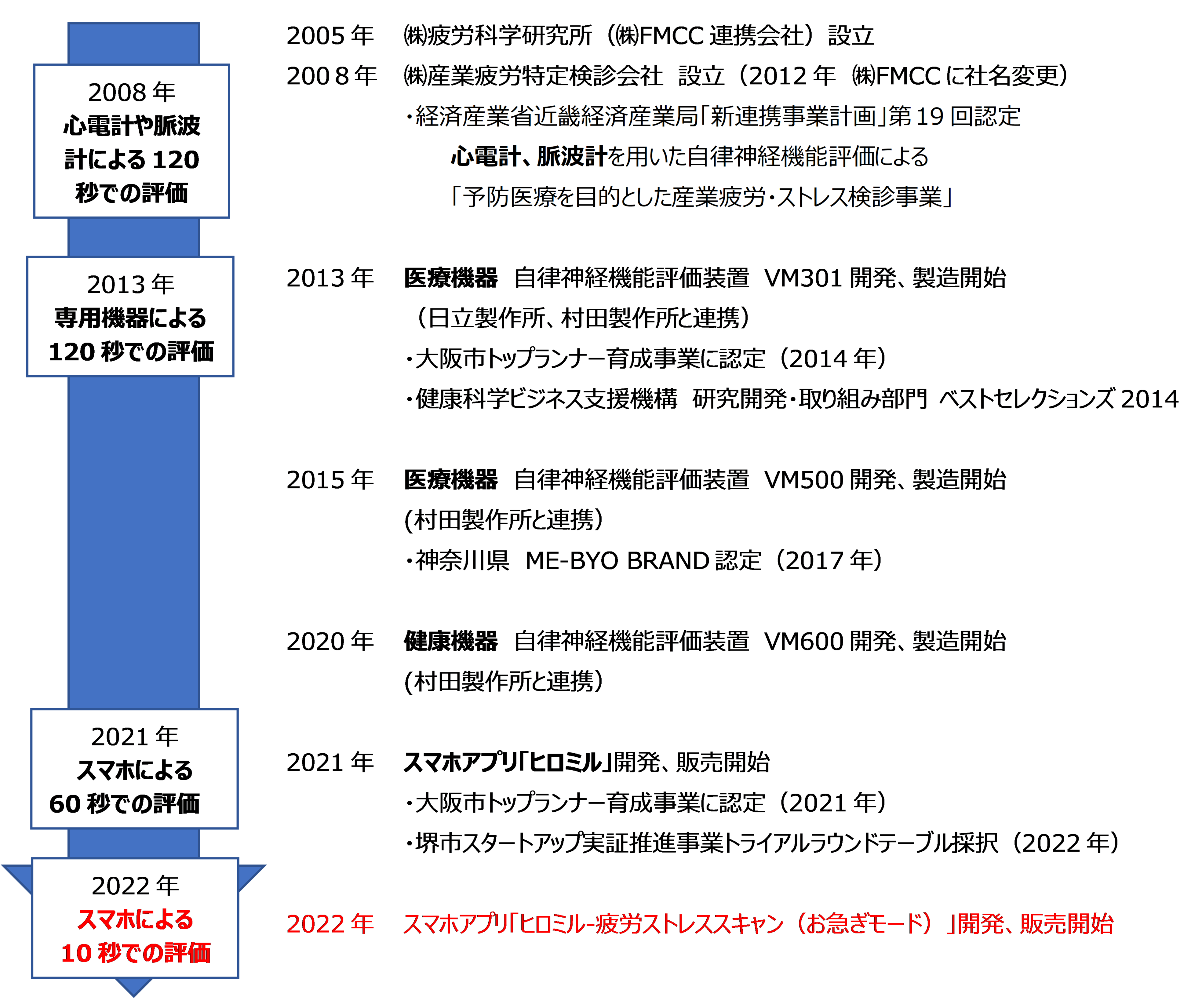 自律神経評価事業を展開する株式会社FMCC(代表取締役:倉恒弘彦)は、スマートフォンのカメラ機能を使って脈拍の間隔をとらえ、その「ゆらぎ」から自律神経機能を評価する技術を開発してきました。2020年11月よりスマホを用いて60秒で自律神経から健康状態を評価するアプリ「ヒロミルー疲労ストレススキャン」をリリースし、高評価をいただいています(2021年度大阪トップランナー育成事業認定)。しかし、朝起きたときや寝る前、仕事に取りかかる前などで日常的に利用しやすくするために、「もっと計測時間を短くできないか」との声を多くいただいておりました。もっと計測時間を短くできれば、忙しい仕事の前後でも利用がしやすく疲労やストレスの蓄積にすぐに気づくことができます。私たちはこれまでの自律神経機能評価事業で得た知見を活かし検討を重ね、これまでとは全く異なる評価アルゴリズムを考案し計測時間短縮に成功いたしました。そしてこの度、2022年10月17日(月)より、たった10秒で脳の疲労を評価することができる「ヒロミルー疲労ストレススキャン(お急ぎモード)」をリリースいたします。