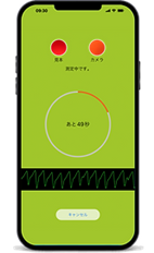 測定方法:「お急ぎ測定」を選択し、音声ガイドに従い、指先をスマートフォンの背面カメラにあてて、安静にして目を閉じてください。スマートフォンのカメラ機能によって指先の血流の変化をとらえます。