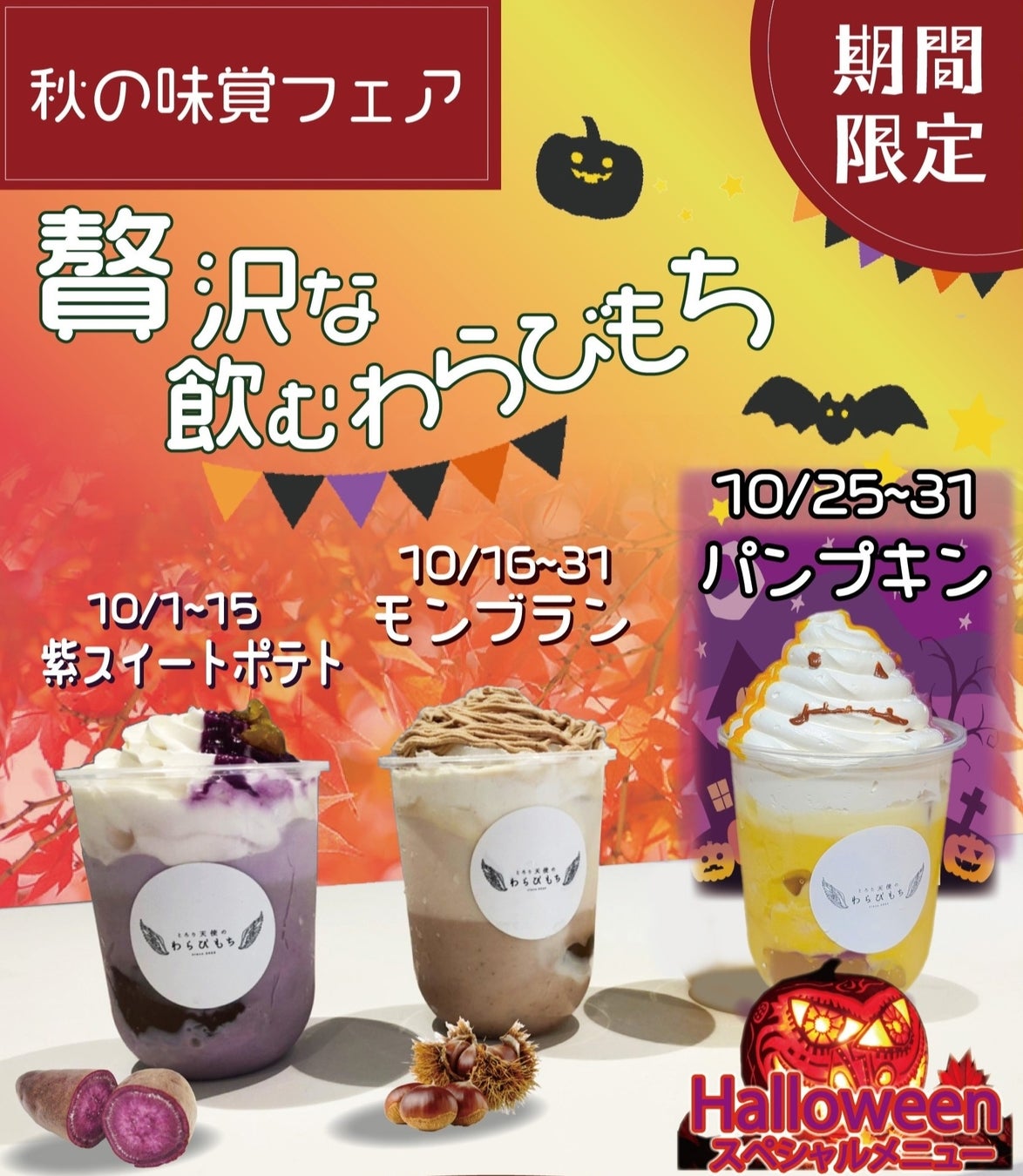 飲むわらびもちモンブラン、飲むわらびもちパンプキンが登場する。
